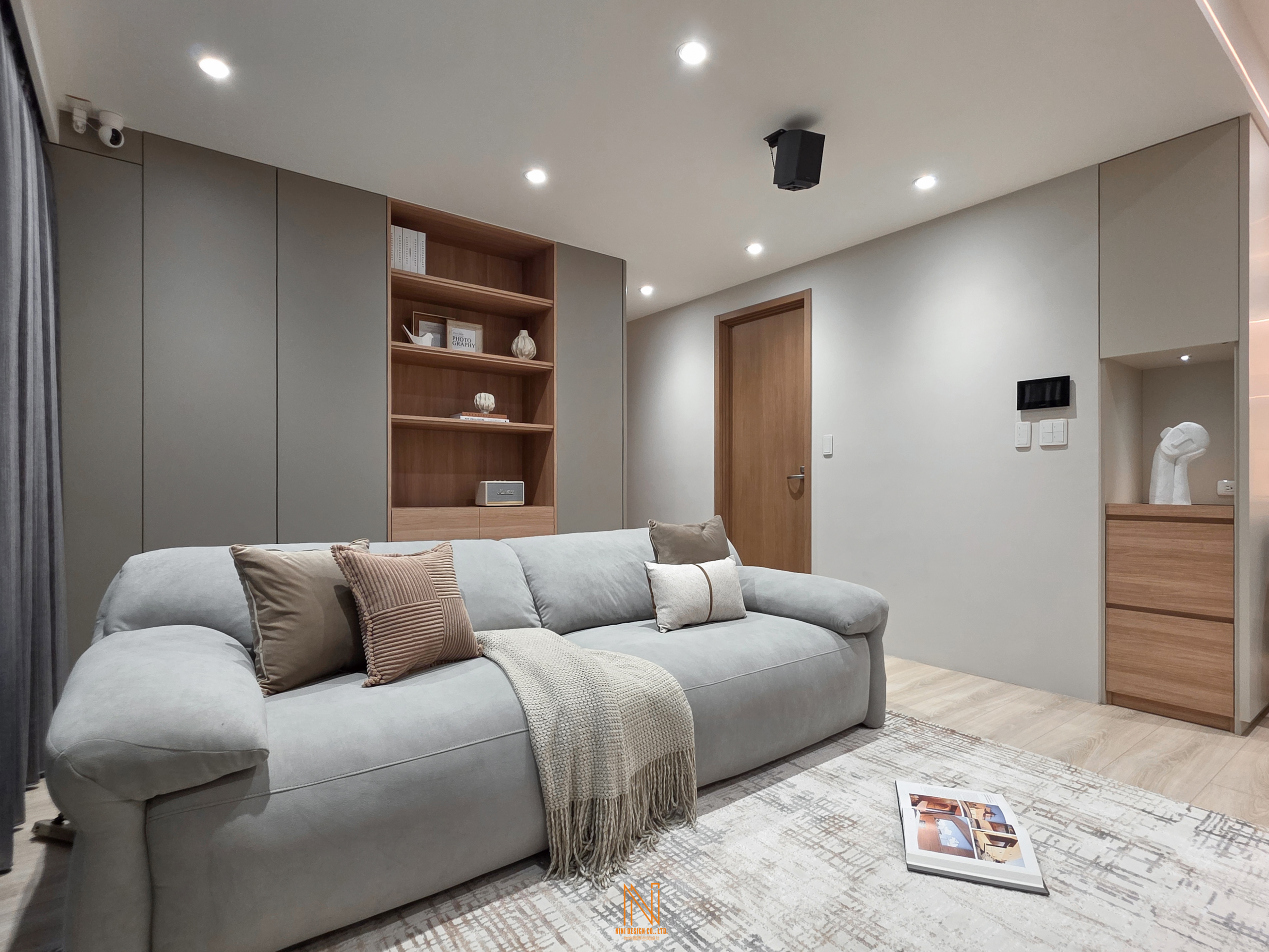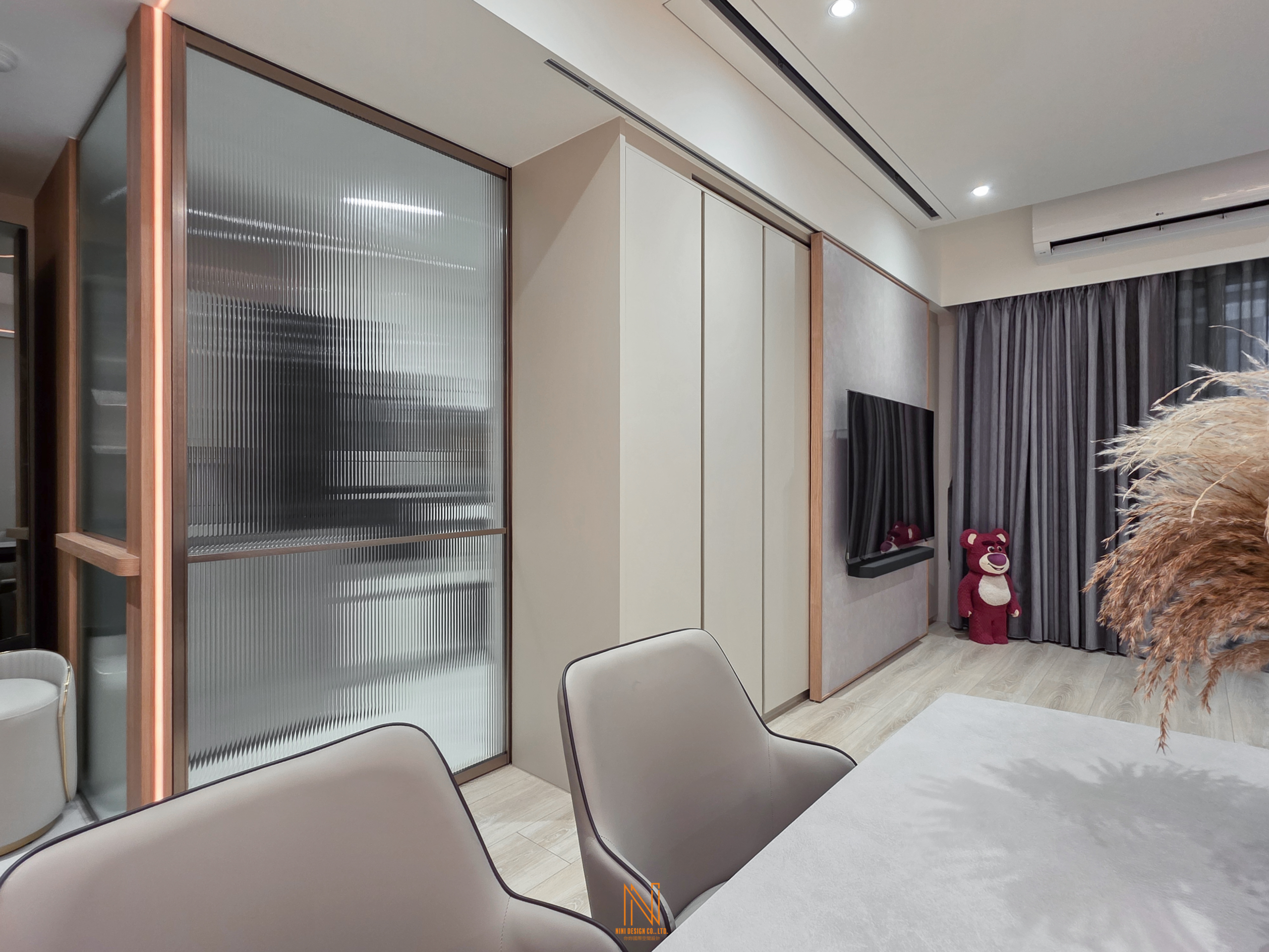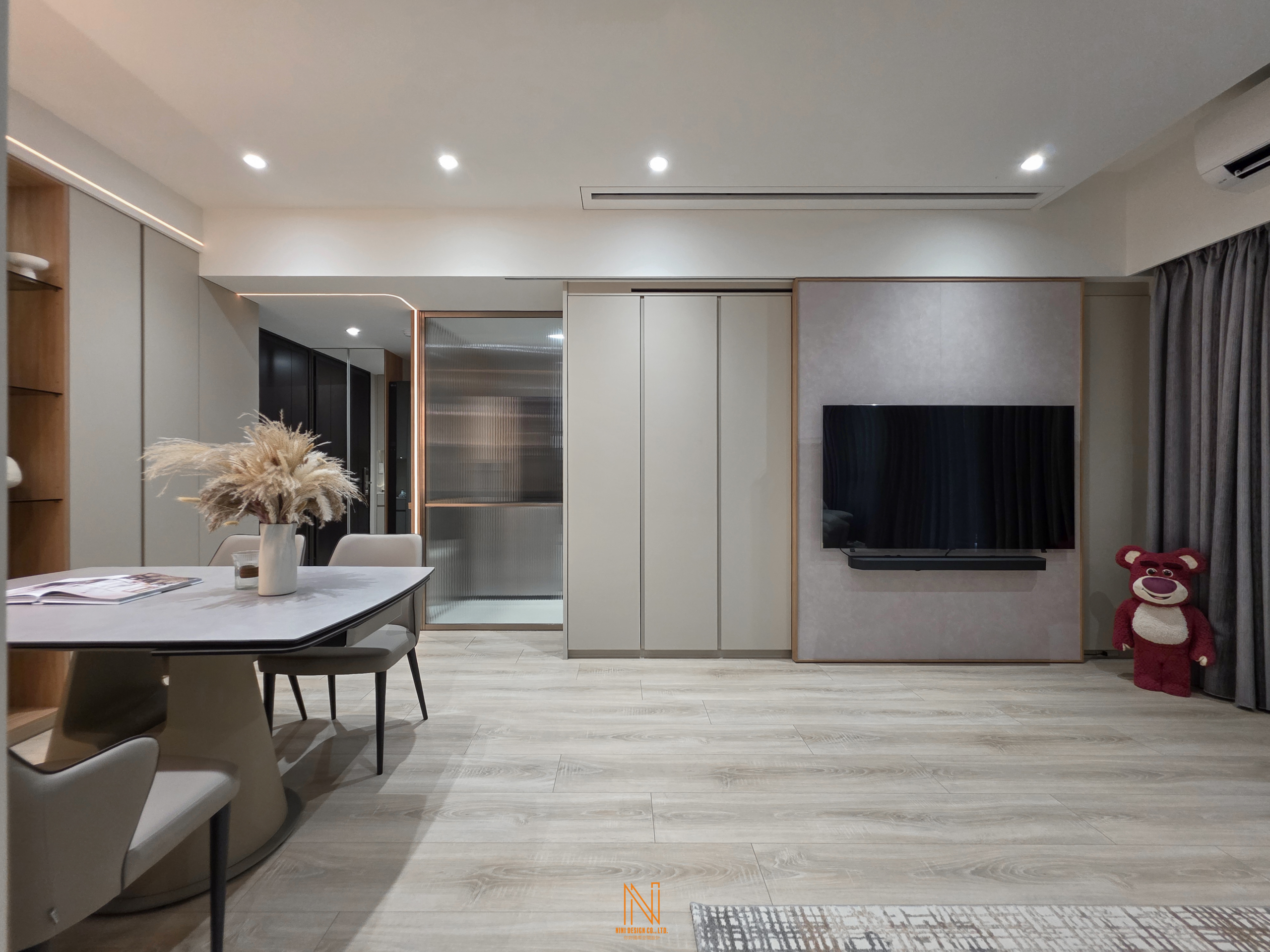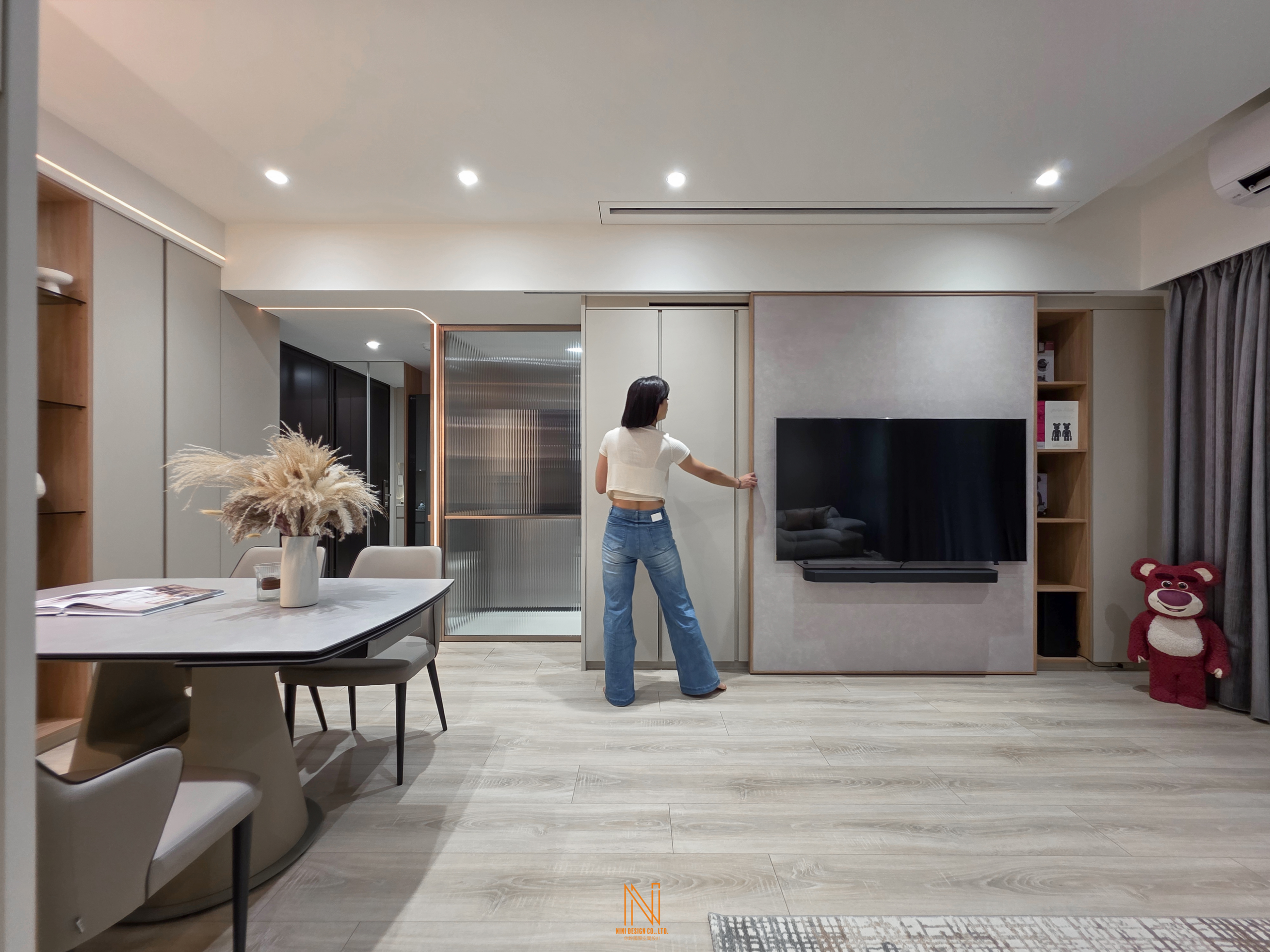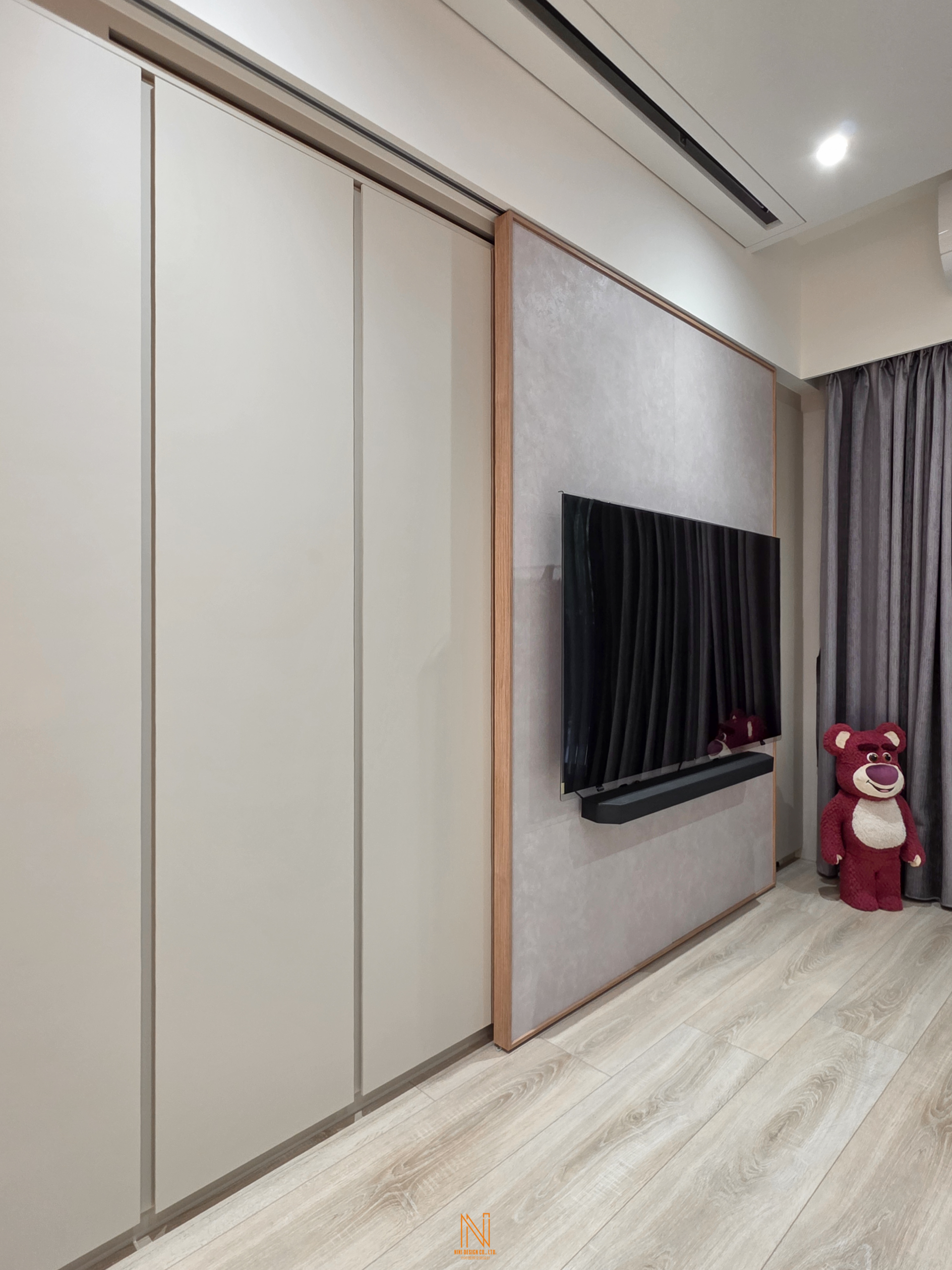 .電視牆整合隱藏式收納設計,讓機能隱於立面之中,維持空間的完整性與延伸感