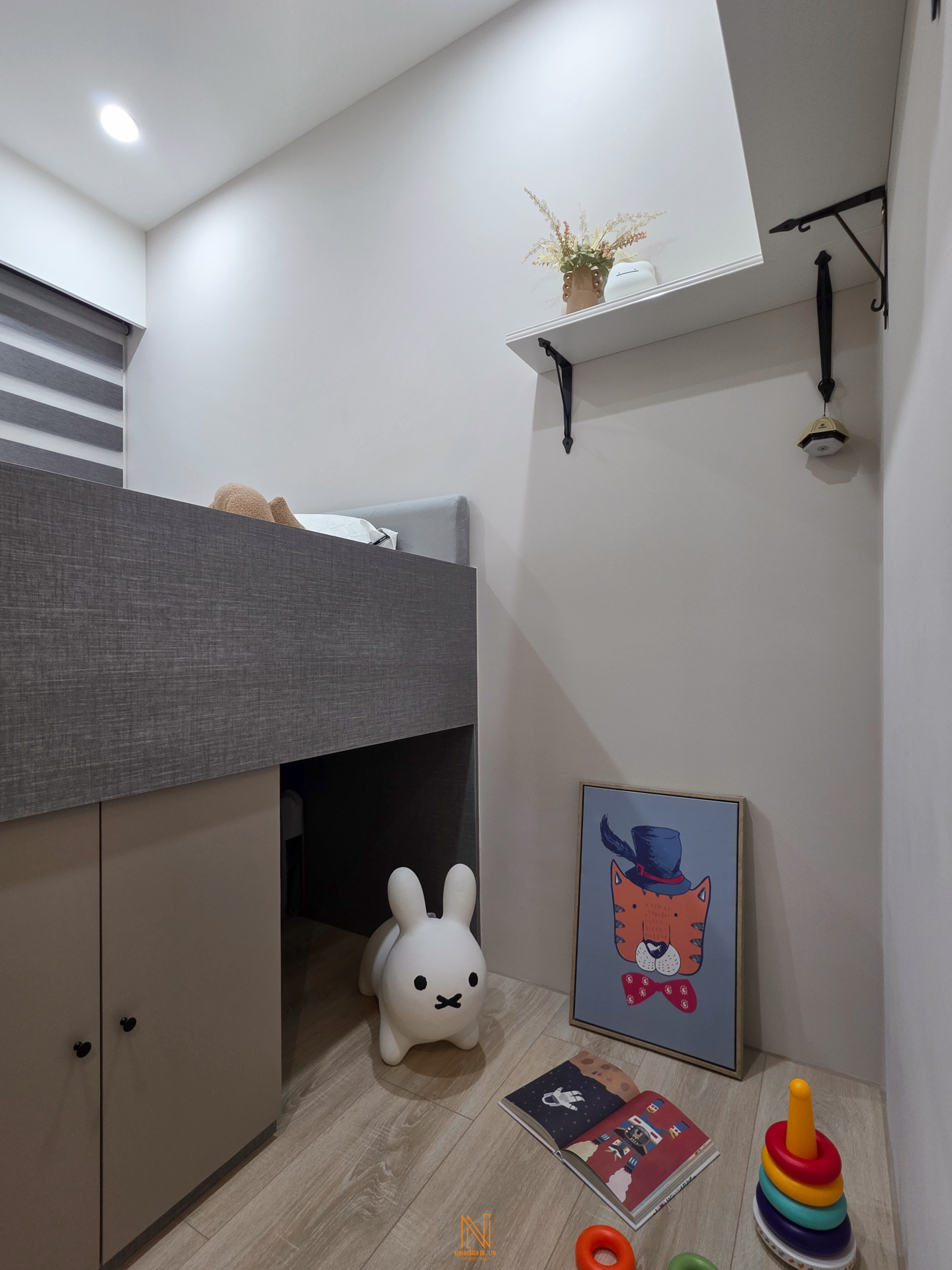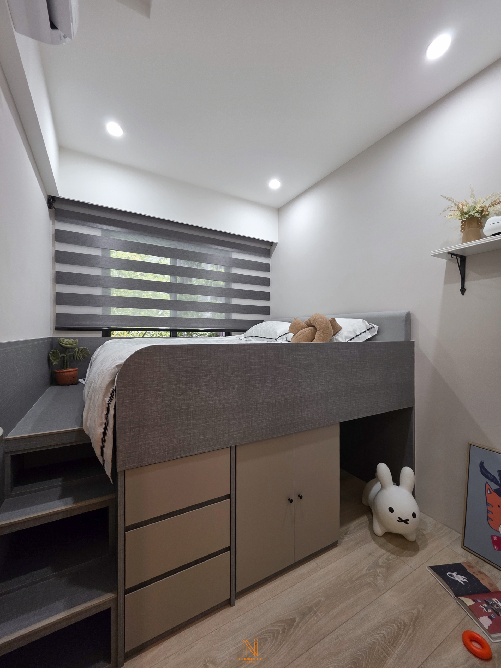 .下層結合收納基地,上層配置 Queen Size 床鋪,兼顧成長彈性與使用舒適度